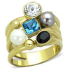 This lovely women's 19mm wide crystal and synthetic pearl cocktail fashion ring is Amazing! Made of solid stainless steel and finished in high quality 14k gold ion plating (mirror polished). This ring features 1 clear crystal stones, 1 aqua blue crystal stones, and 1 black crystal stone alongside a white and gray synthetic pearl in a pave classic cocktail setting. This ring has Top quality stones and displays amazing enriched clarity just like real diamonds!