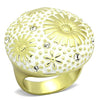 This beautiful 14k gold ion plated AAA grade crystal Dome ring is Amazing! Made of solid stainless steel and finished in high quality 14k gold ion plating (mirror polished). This ring features 9 (1mm) clear round crystals in a pave setting on a white epoxy dome alongside various flower designs. The total carat weight is approx. 0.045 diamond equivalent. This ring has Top quality stones and displays amazing enriched clarity just like real diamonds!