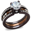 This beautiful 2 piece chocolate ion plated AAA grade cubic zirconia wedding set is Amazing! Made of solid stainless steel and finished in high quality 14k dark & light brown ion plating. Dark chocolate engagement ring features a 2.04 ct (8mm) round brilliant cut center stone alongside 40 pave set round stones. Matching light chocolate wedding band has 14 round pave set stones and slides into the engagement ring. Set gives the look of 3 bands. Total carat weight is approx 2.75 diamond equivalent. This set has Top quality stones and displays amazing enriched clarity just like real diamonds! Stainless Steel jewelry is durable, hypo-allergenic and will not tarnish or oxidize over time.