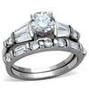 This beautiful 2 piece high polished stainless steel 2.50 ct AAA grade cubic zirconia wedding set is Amazing! Made of solid stainless steel and a high polished finish (no plating). This Engagement ring features a 1.03 ct (6.5mm) round brilliant cut center stone alongside 6 tapered baguette and 2 round side stones. Matching wedding band has 5 round stones and 2 baguettes in a prong setting. Total carat weight is approx. 2.50 diamond equivalent. This set has Top quality stones and displays amazing enriched clarity just like real diamonds! Stainless Steel jewelry is durable, hypo-allergenic and will not tarnish or oxidize over time.