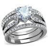 This beautiful 3 piece high polished stainless steel 3.15 ct heart AAA grade cubic zirconia wedding set is Amazing! Made of solid stainless steel and a high polished finish (no plating). This Engagement ring features a 1.71 ct (8mm) heart shape center stone alongside 30 round side stones. Matching wedding bands have another 17 pave round stones each for a total of 34 stones. Total carat weight is approx 3.15 diamond equivalent. This set has Top quality stones and displays amazing enriched clarity just like real diamonds! Stainless Steel jewelry is durable, hypo-allergenic and will not tarnish or oxidize over time.
