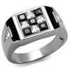 Men's top grade crystal ring. Features 5 (3.25mm) black princess cut stones accented by 4 (3.25) clear princess cut stones to form a checkered box design, and 2 clear round cut stones on the sides of the band. Total carat weight is 2.56 diamond equivalent. Top quality stones display enriched clarity just like real diamond! Surgical Stainless Steel Tusk 316 is durable, hypo-allergenic and will not oxidize or tarnish over time. Made of solid stainless steel 316 and a high polish finish (no plating) for maximum shine and protection.