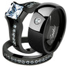 This 2.10 Ct black ion plated stainless steel 2 pc bridal set reflects a traditional look with modern styling. A classic princess cut 6mm 1.25 Ct cubic zirconia is set high above the accompanying 21 1mm Czs on the engagement ring. The matching wedding band includes 11 additional pave set round cut Czs. Shimmering AAA grade CZs, superbly display all the clarity of real diamonds.