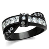 This stunning AAA grade cubic zirconia black ion plated fashion ring is Amazing! Made of solid stainless steel and finished in a high quality black ion plating. This ring features eight .18 ct (3mm) princess cut clear cz stones in a channel setting, alongside 10 pave set round stones. The total carat weight is approximately 1.75 diamond equivalent. This ring has Top quality stones and displays amazing enriched clarity just like real diamonds! Stainless Steel jewelry is durable, hypo-allergenic and will not tarnish or oxidize over time.