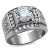Men's AAA Grade Simulated Diamond Ring. Features a 2.75 Ct (9mm) clear round brilliant cut center stone in a prong setting, accented by 32 (2.25mm) clear round brilliant cut stones in a pave setting. Total carat weight is 4.03 diamond equivalent. Top quality stones display enriched clarity just like real diamonds! Surgical Stainless Steel Tusk 316 is durable, hypo-allergenic and will not oxidize or tarnish over time. Made of solid stainless steel 316 and a high polish finish (no plating) for maximum shine and protection.