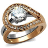 This beautiful 2 piece two toned ion plated stainless steel 1.67 ct AAA grade cubic zirconia wedding set is Amazing! Made of solid stainless steel finished in high quality rose gold ion plating (mirror polish). Engagement ring features a 1.28 ct (7mm) round cut prong set solitaire stone. Matching wedding band has 26 (1.5mm) round stones. Solitaire engagement ring fits between wedding band in a ring guard design for a complete set. Total carat weight is approx 1.67 diamond equivalent. This set has Top quality stones and displays amazing enriched clarity just like real diamonds! Stainless Steel jewelry is durable, hypo-allergenic and will not tarnish or oxidize over time.